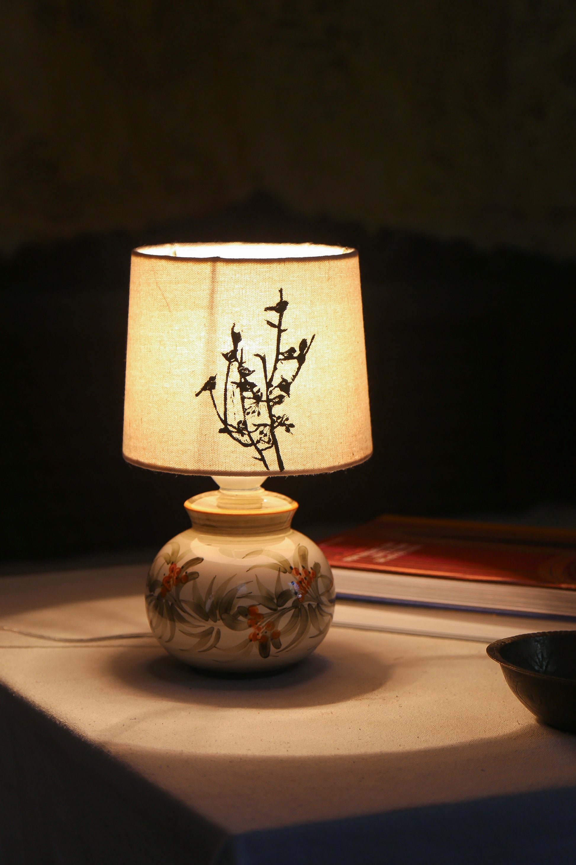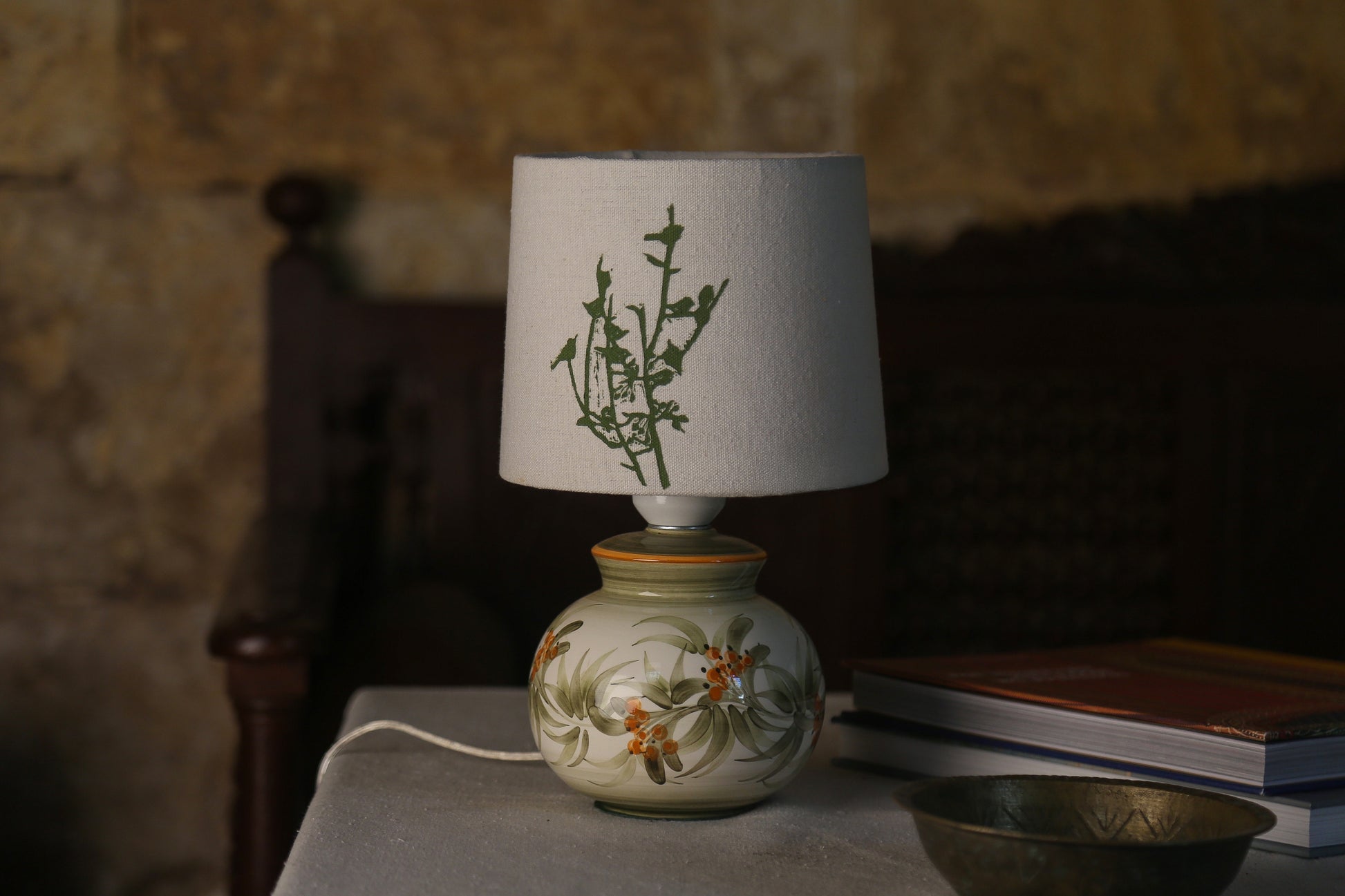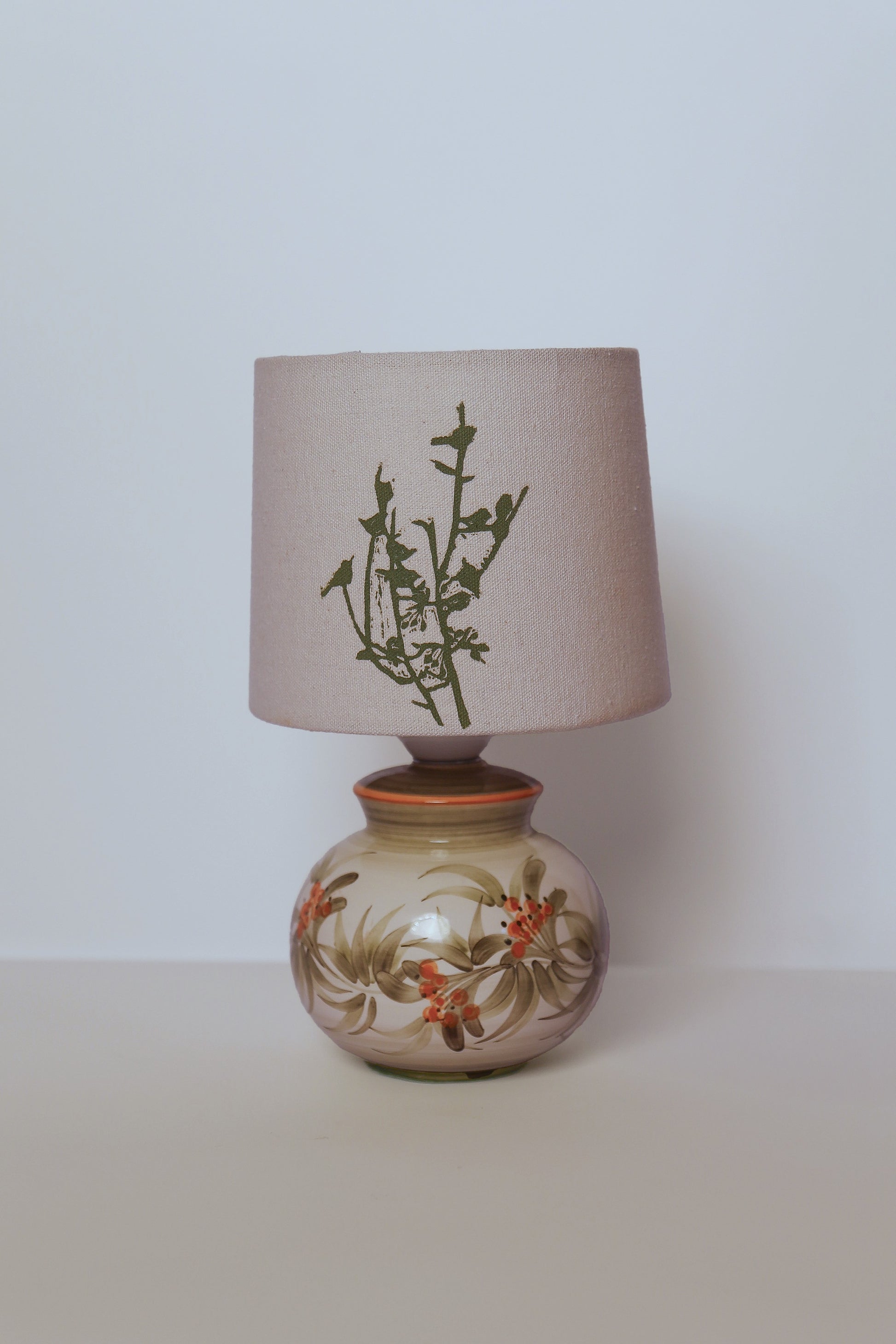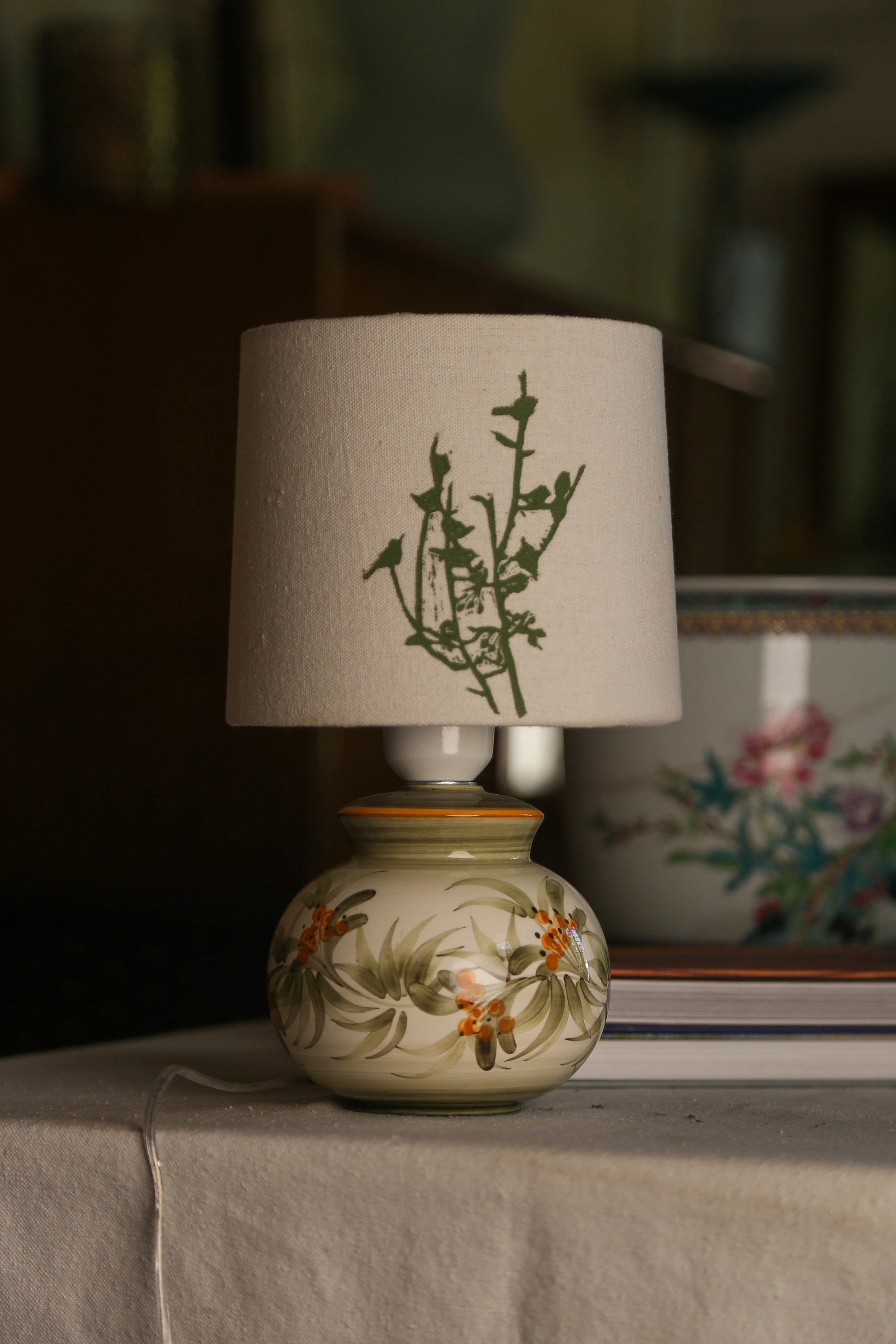 The base is a vintage, hand-painted ceramic piece from Jersey Pottery.