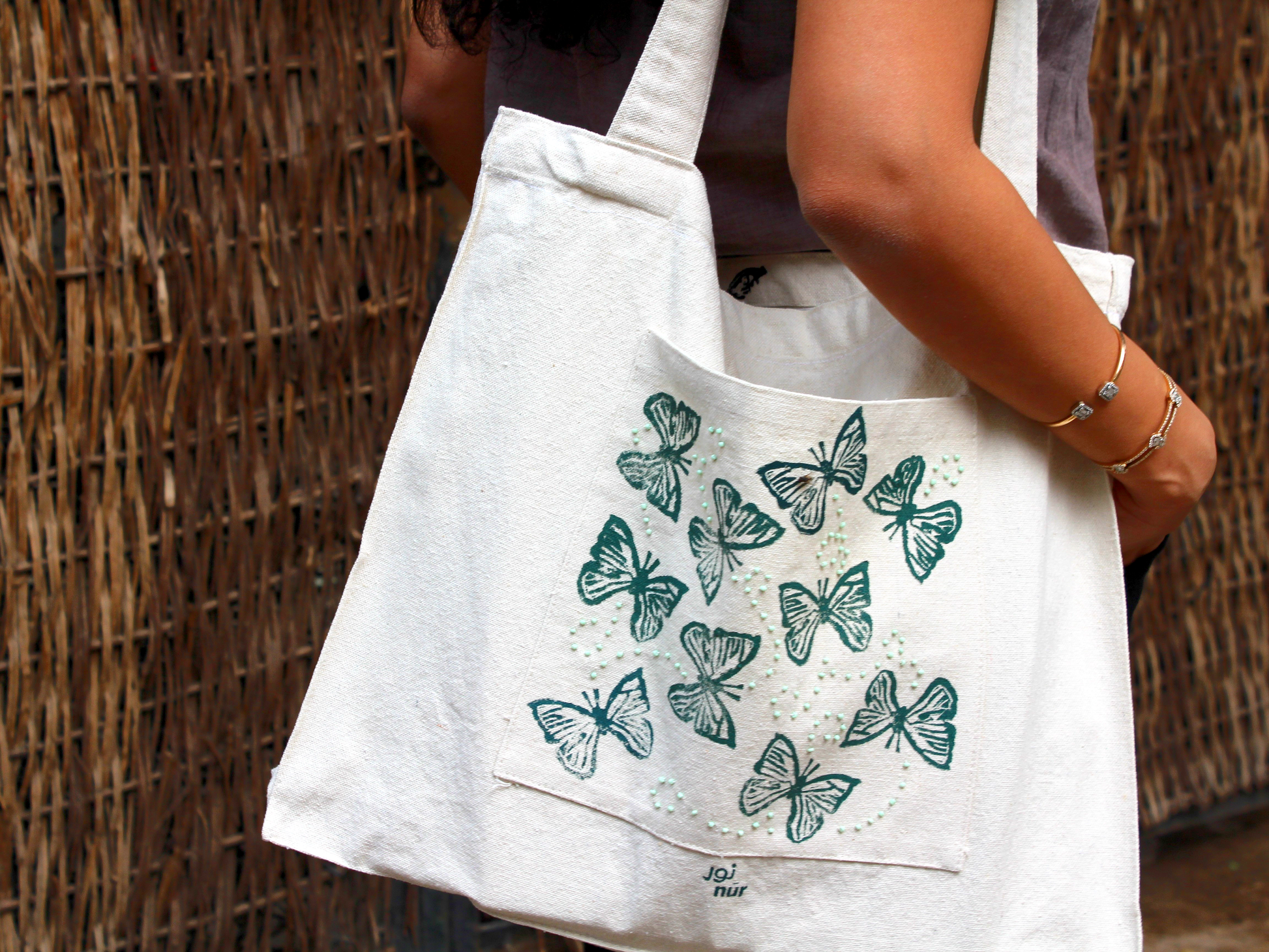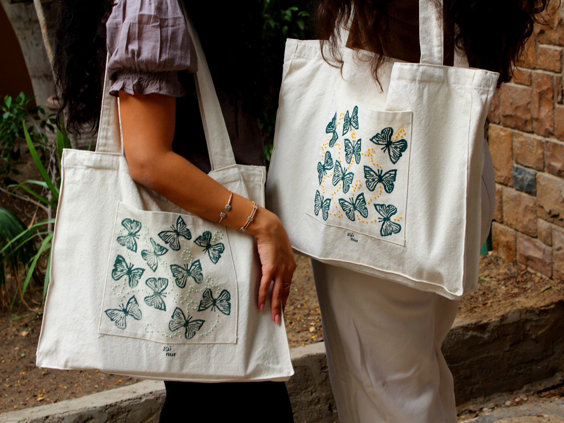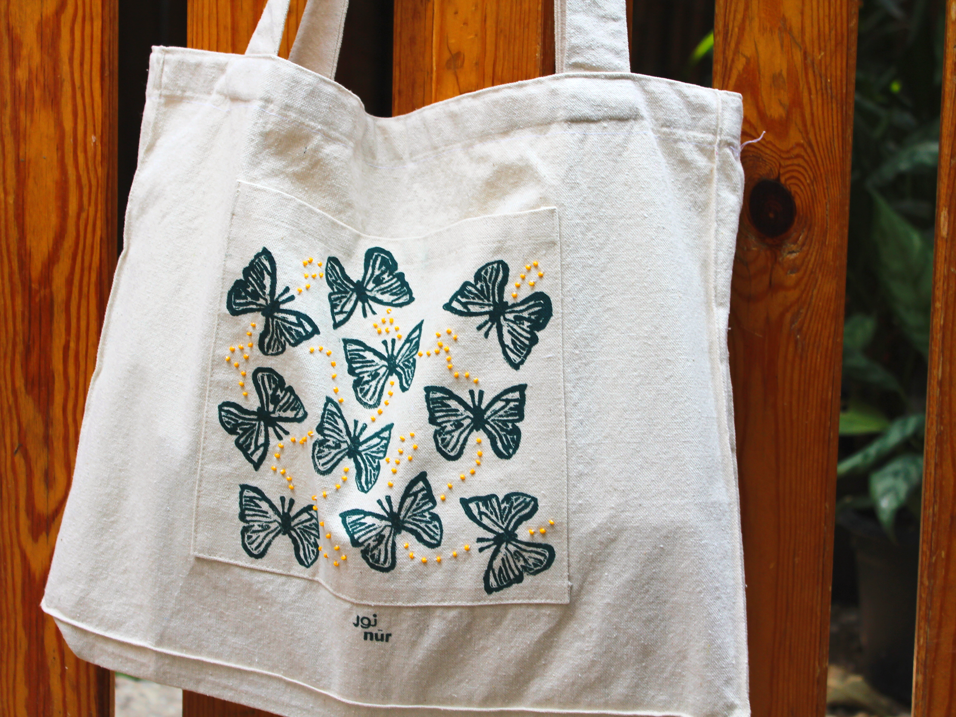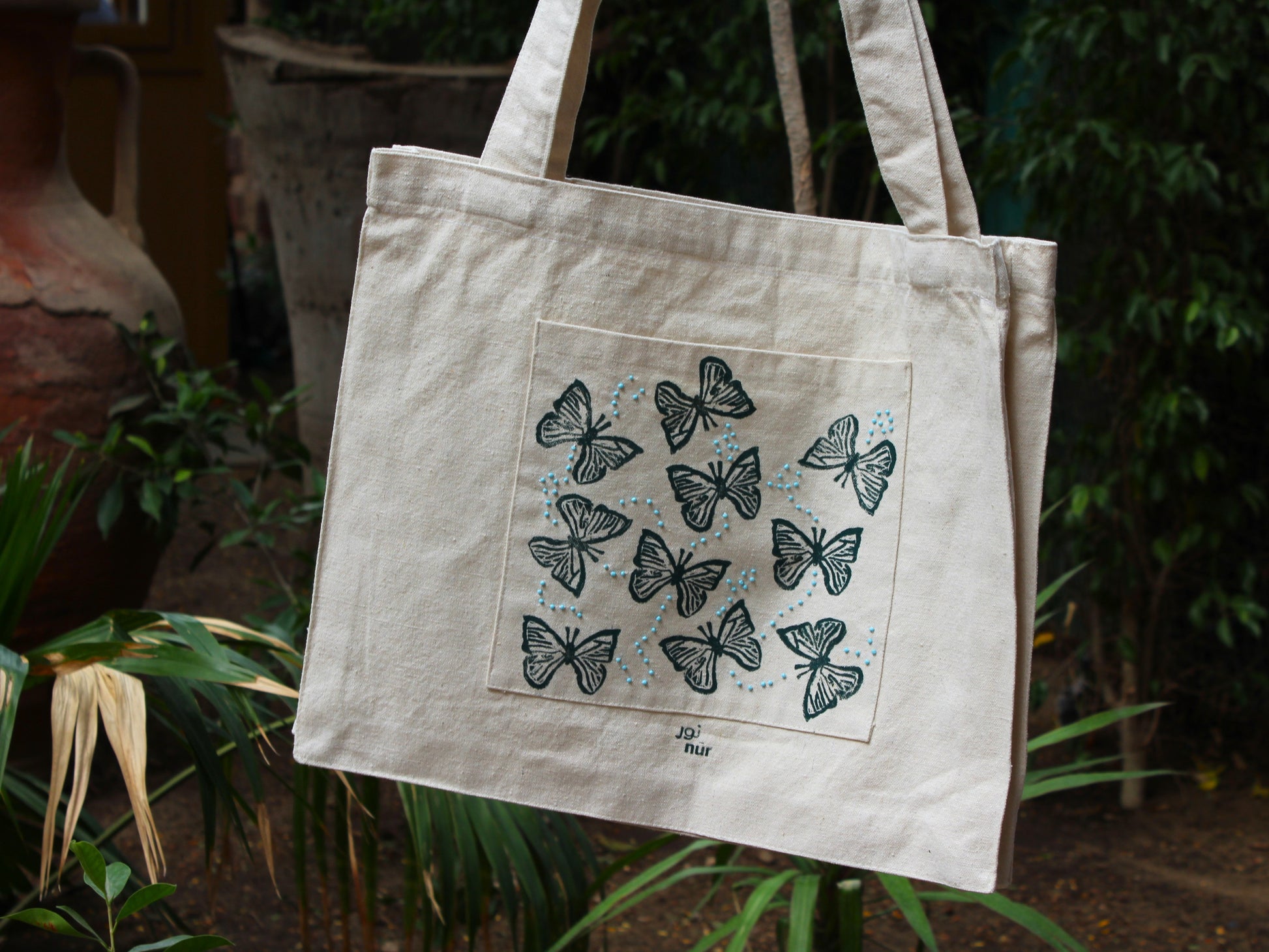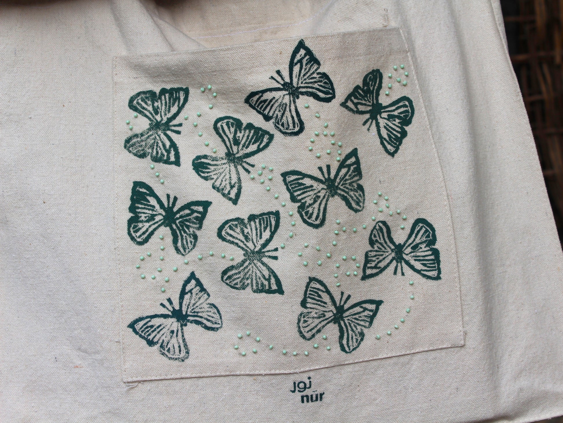 Large tote in our Farasha design, hand-printed on locally sourced Duk fabric and enhanced with beads by @hagerelsayed/@3ion, adding texture and shine. Very limited quantities.