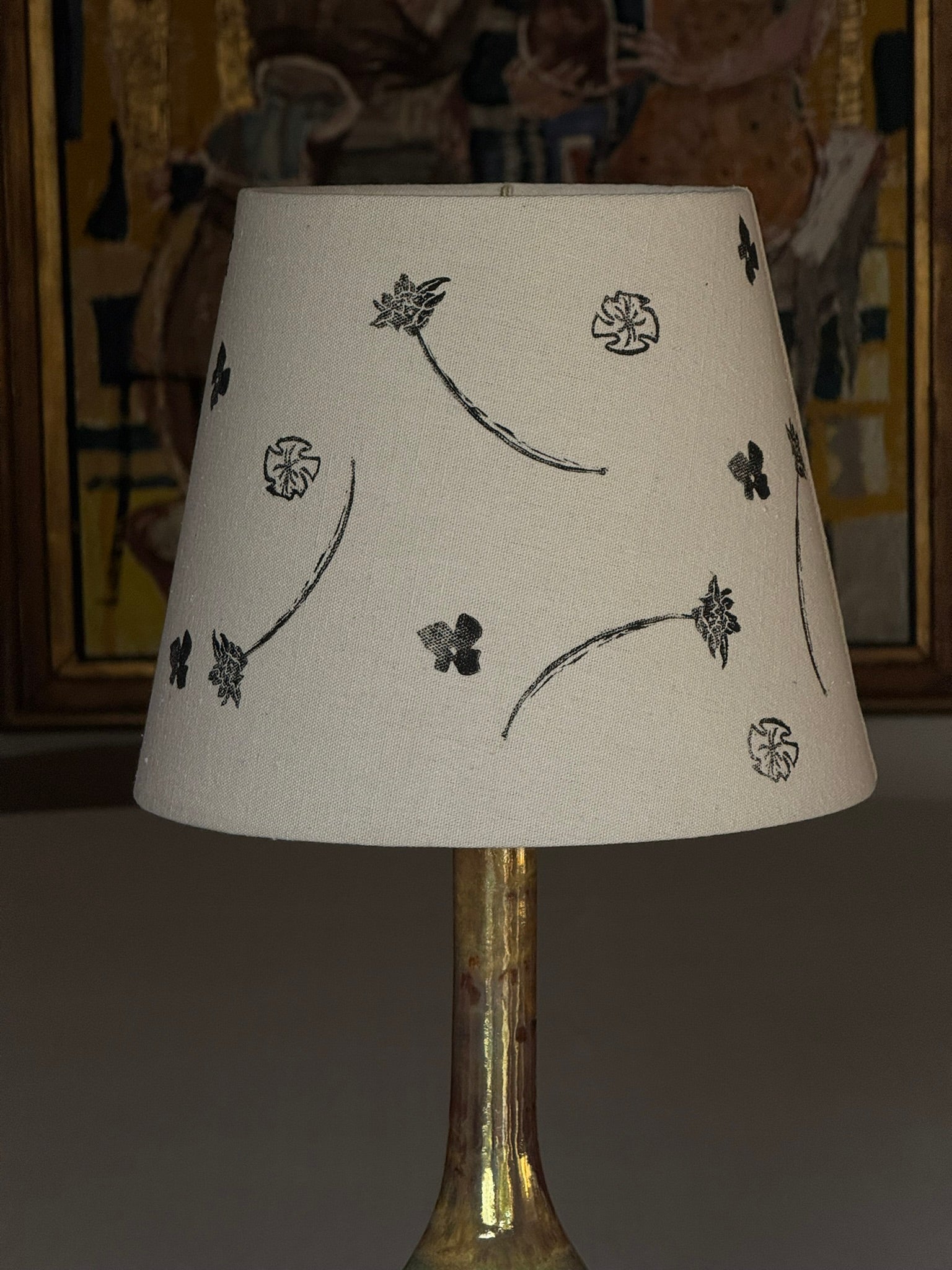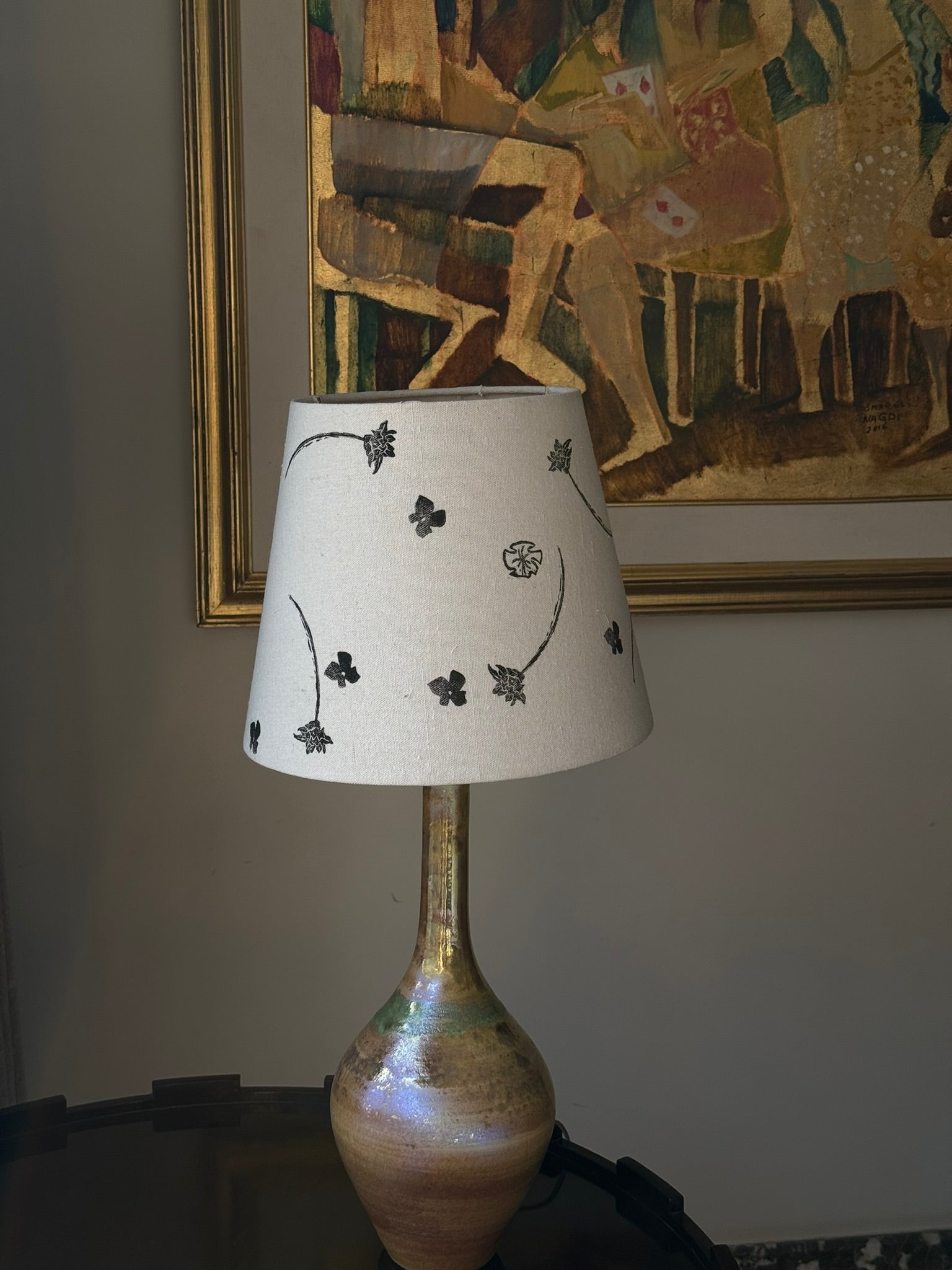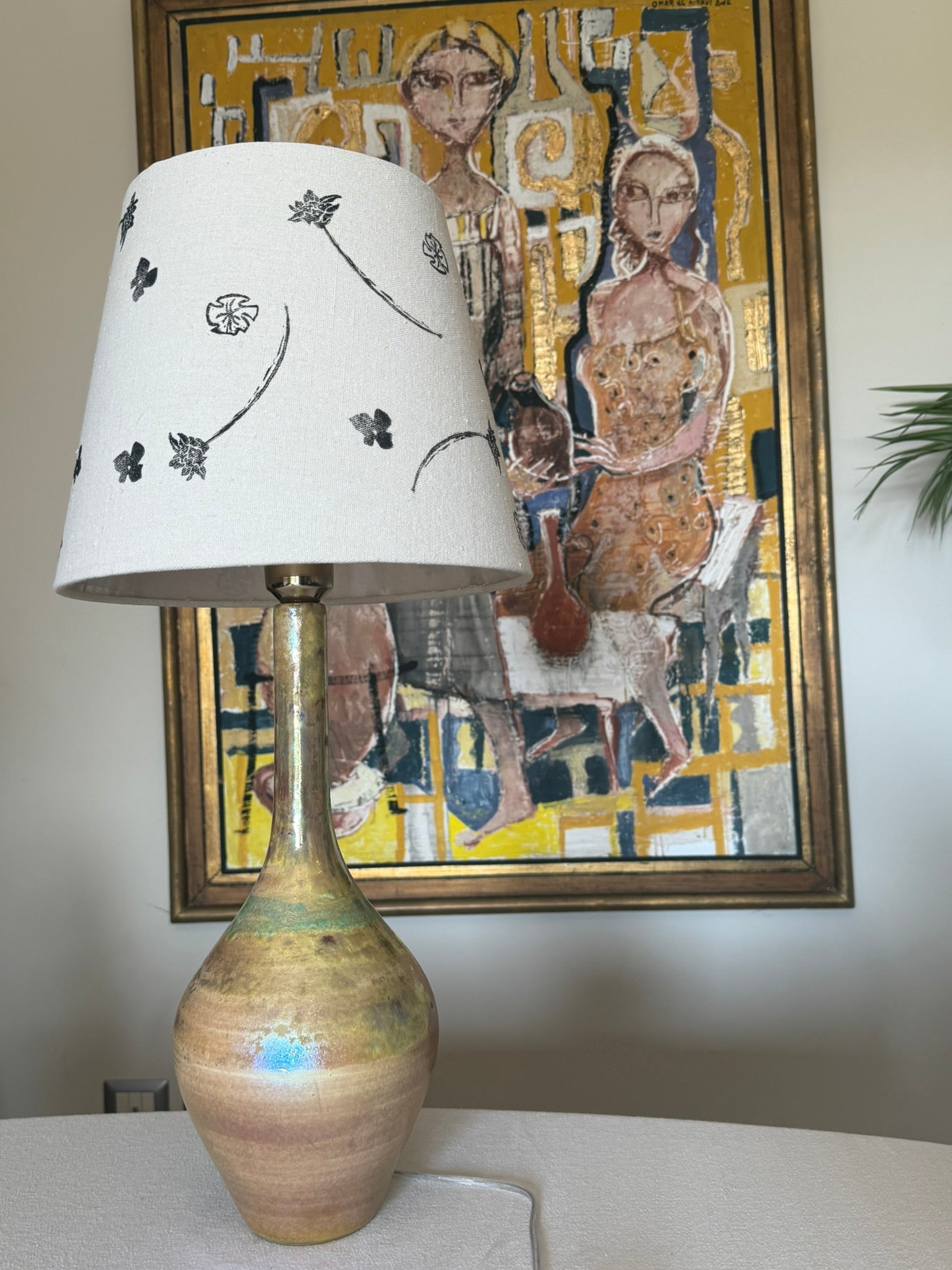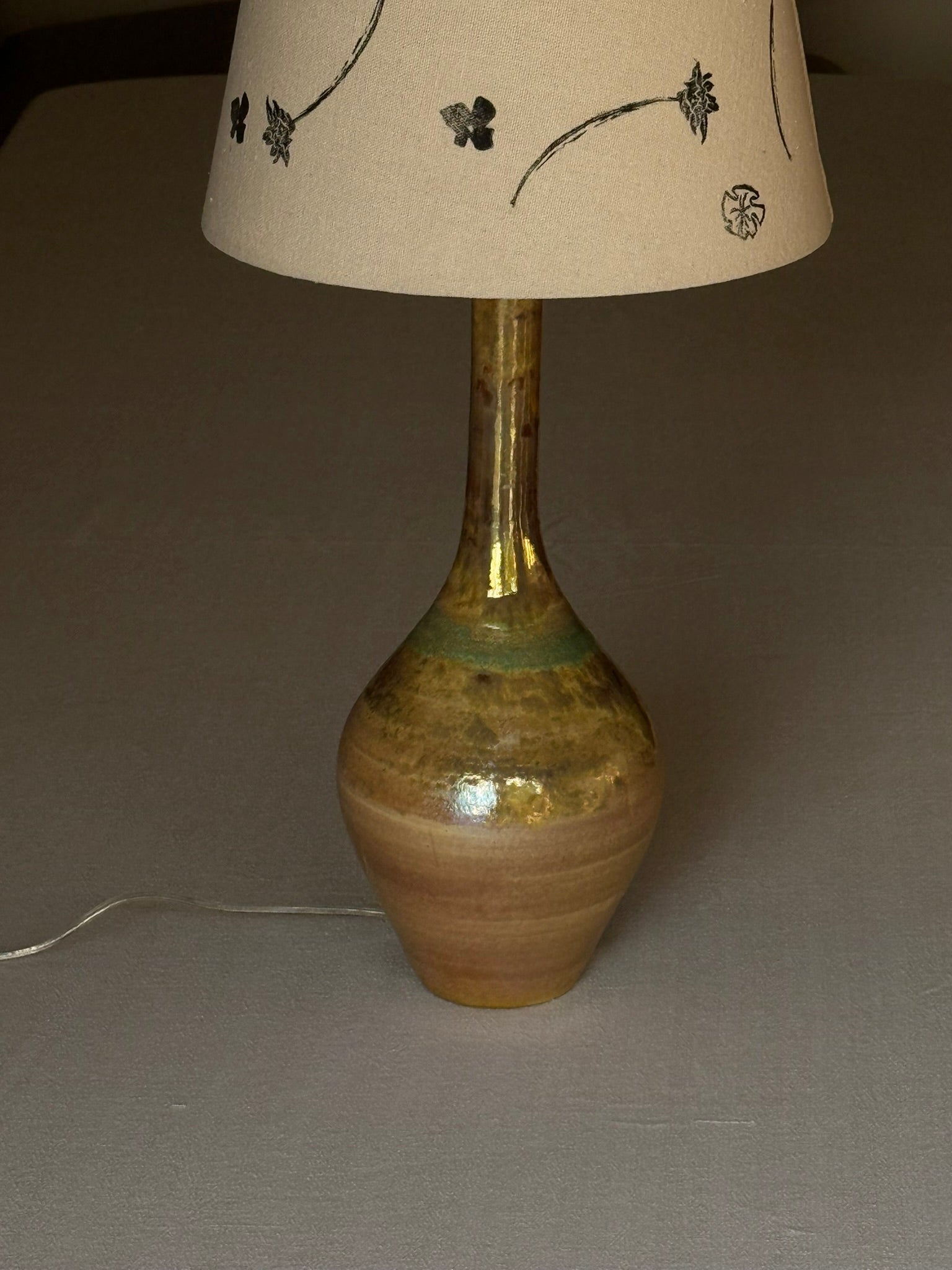 A table lamp with a copper-glazed ceramic base and a shade adorned with a subtle black floral motif.