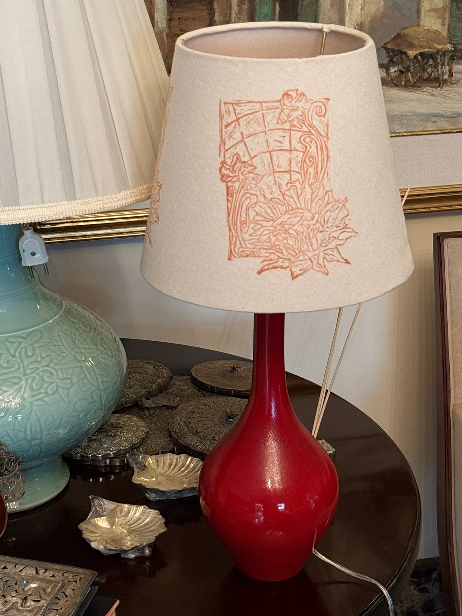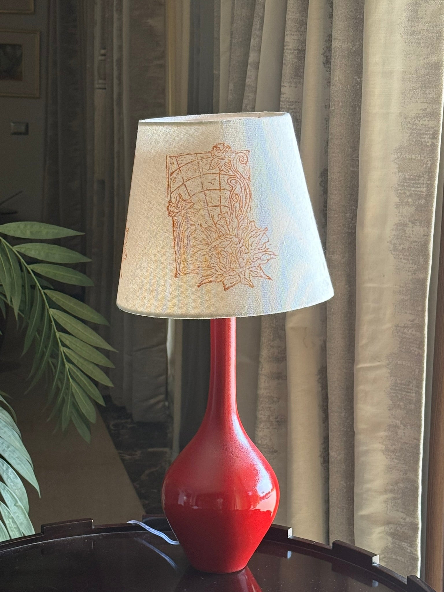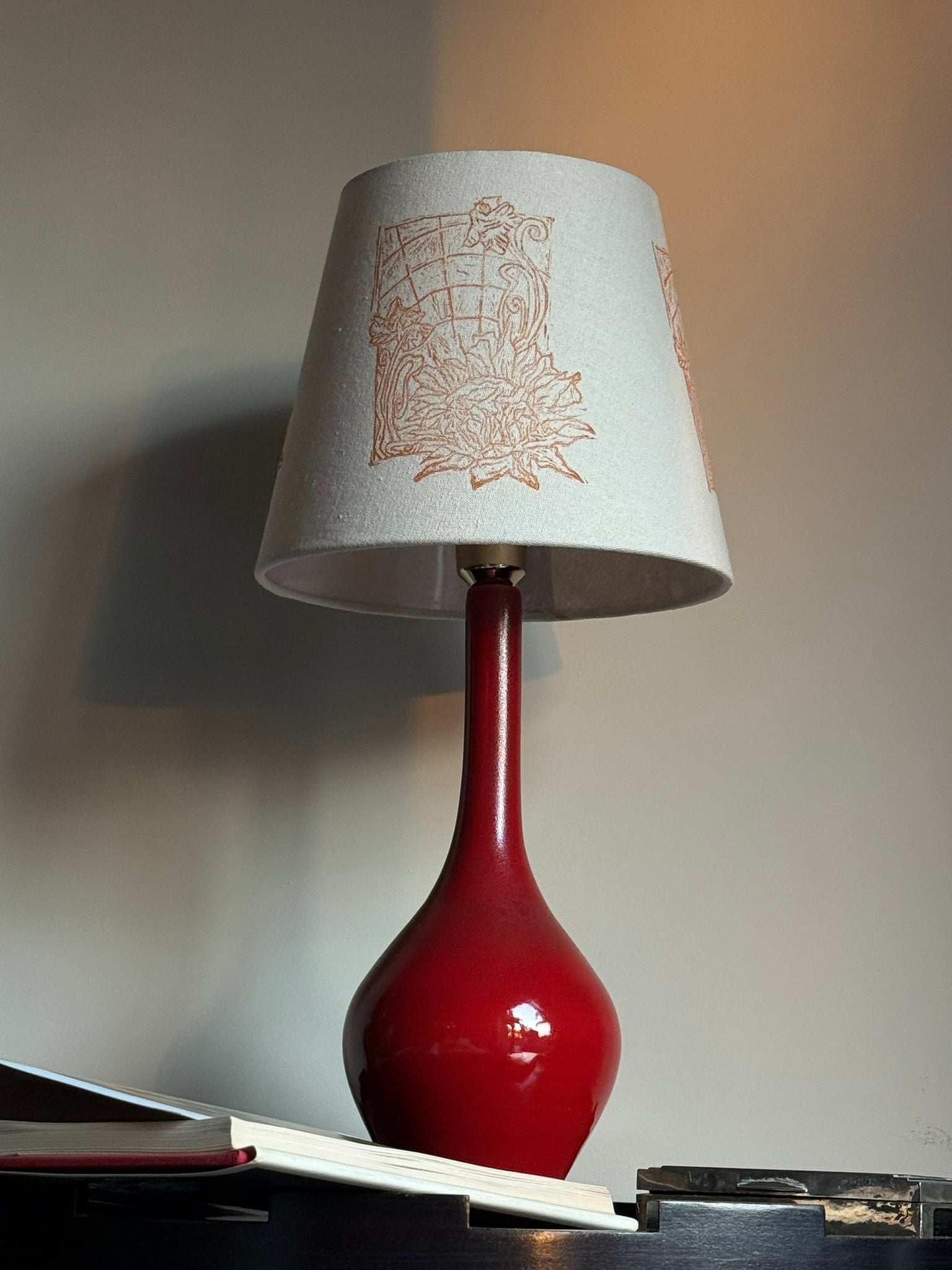 A table lamp with a bold red ceramic base and a shade featuring a detailed Art Nouveau style sunflower, capturing the essence of a dreamy feeling.