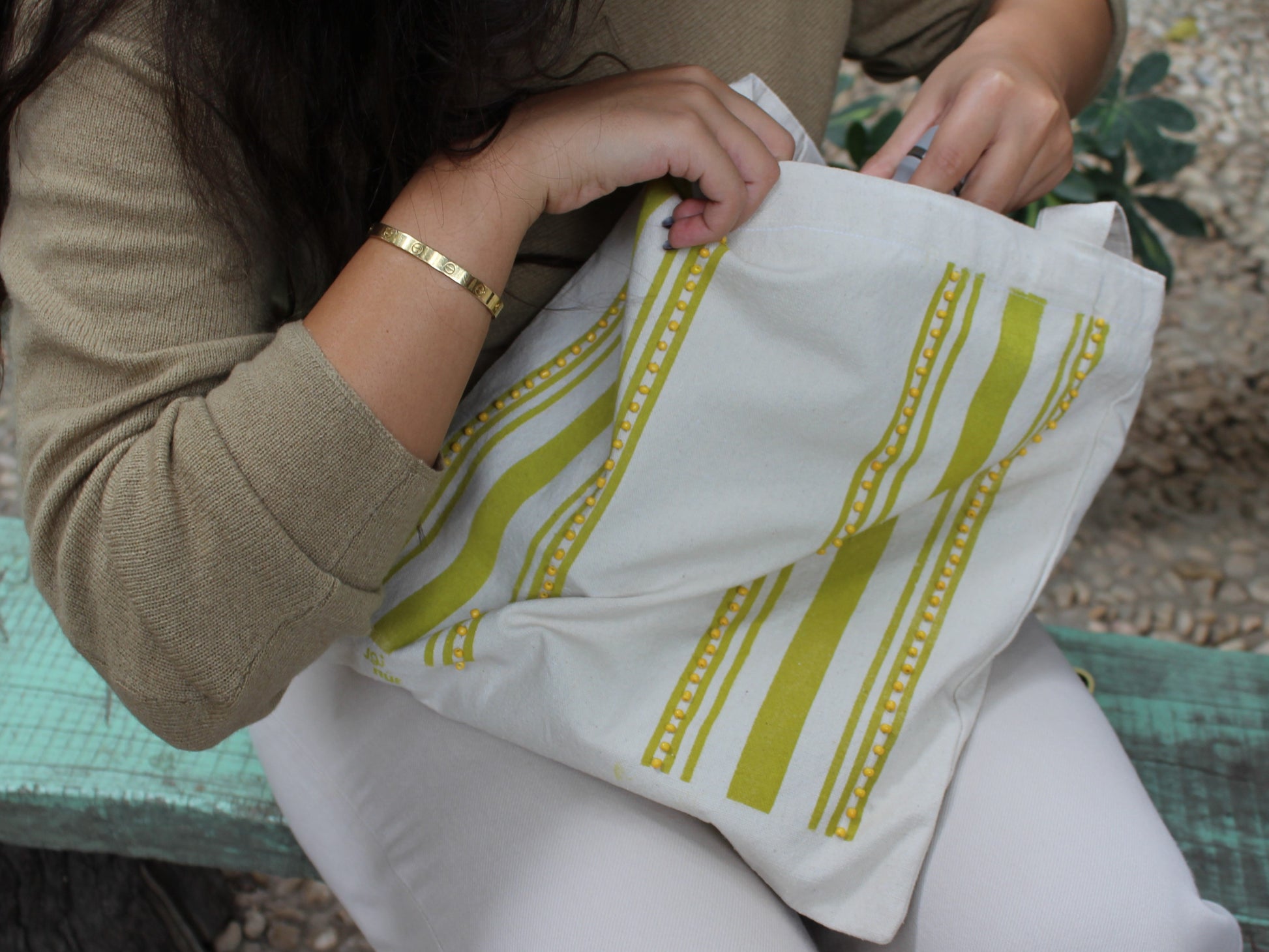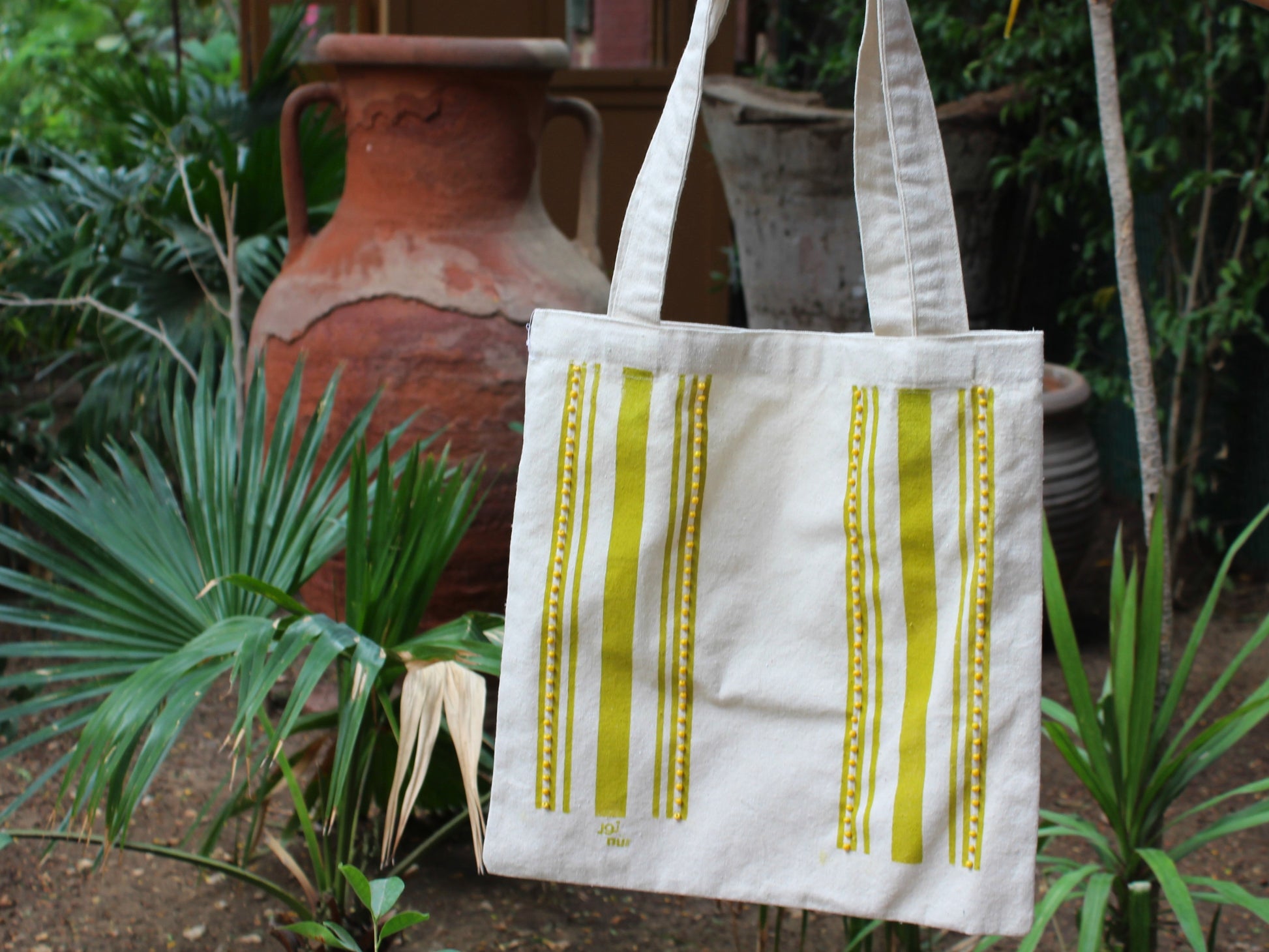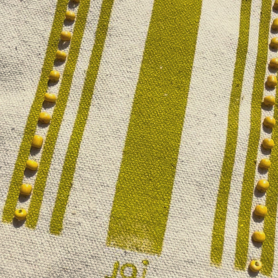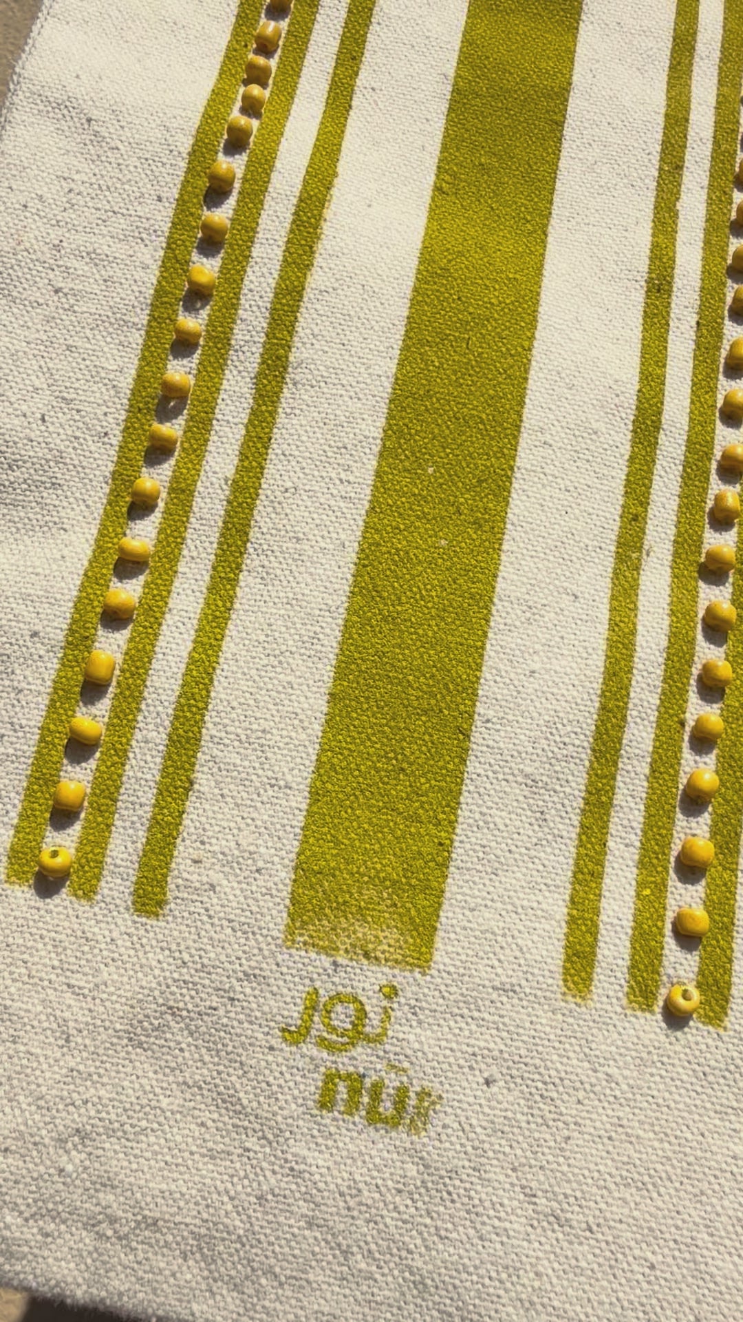 Tote in our Stripes for Life design, hand-printed on locally sourced Duk fabric and enhanced with beads by @hagerelsayed/@3ion, adding texture and shine. Very limited quantities.