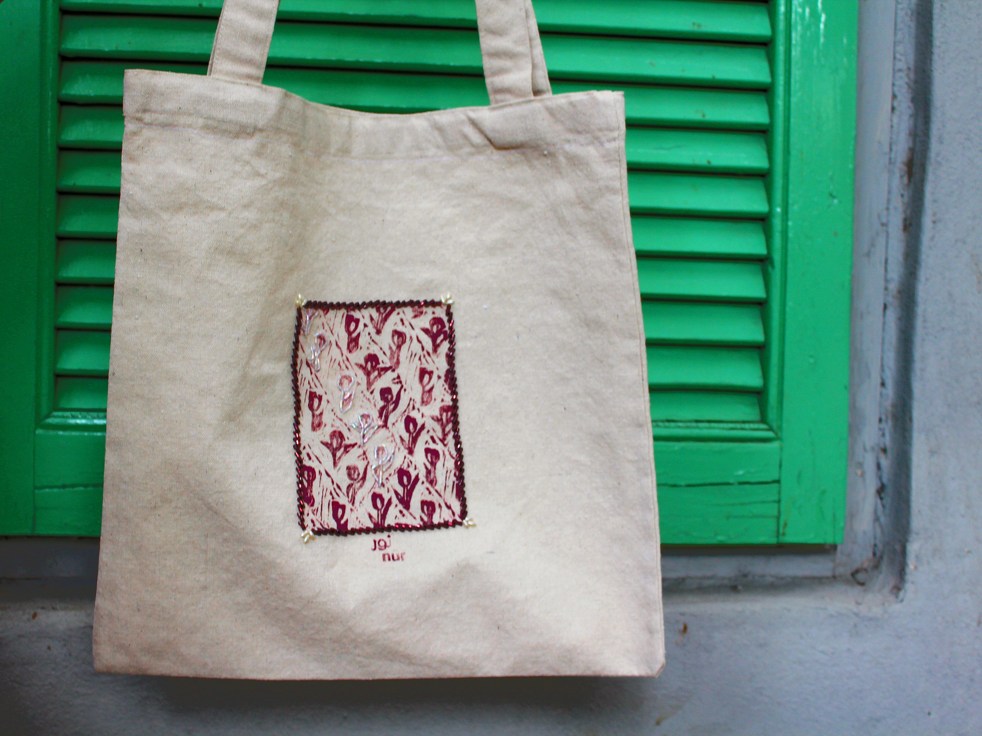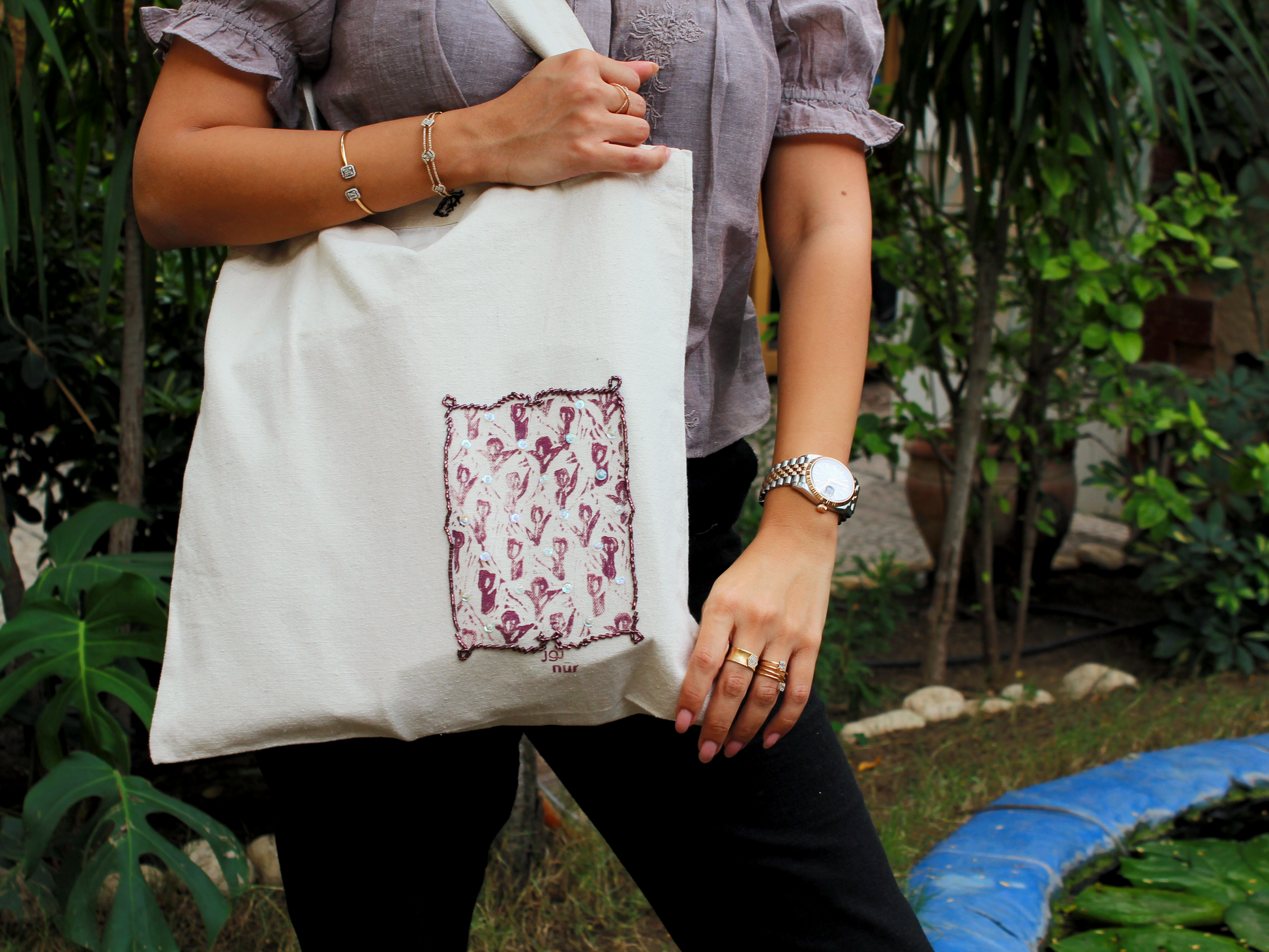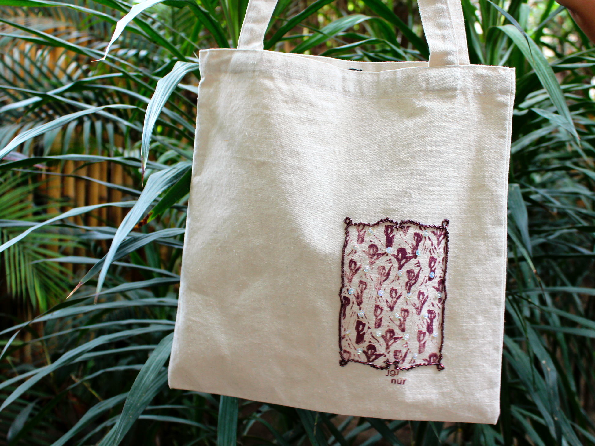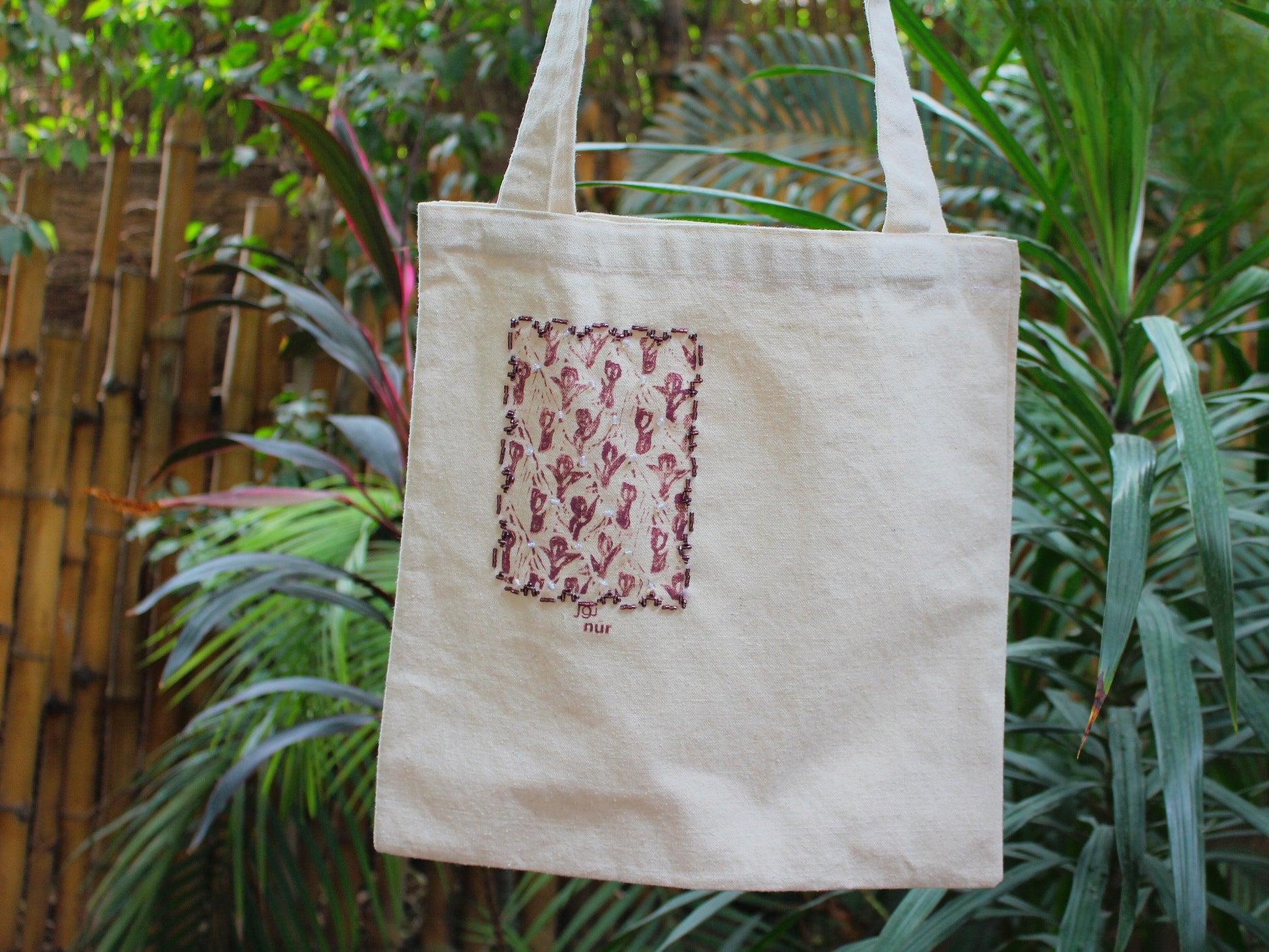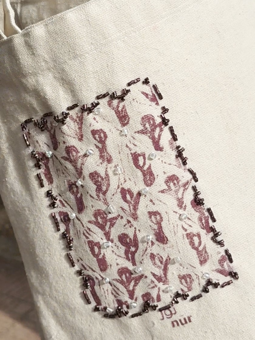 Tote in our Tulip Tales design, hand-printed on locally sourced Duk fabric and enhanced with beads by @hagerelsayed/@3ion, adding texture and shine. Very limited quantities.