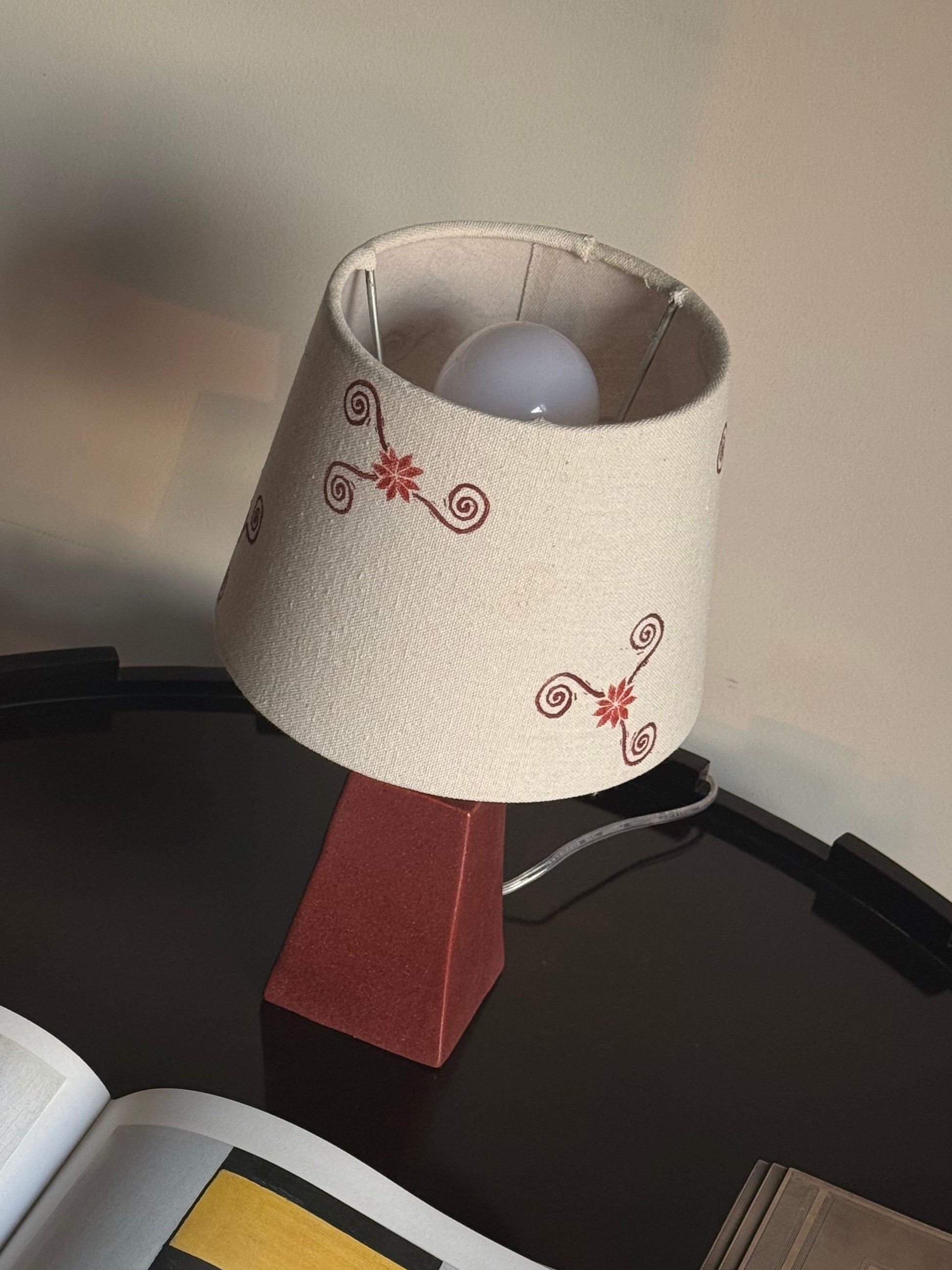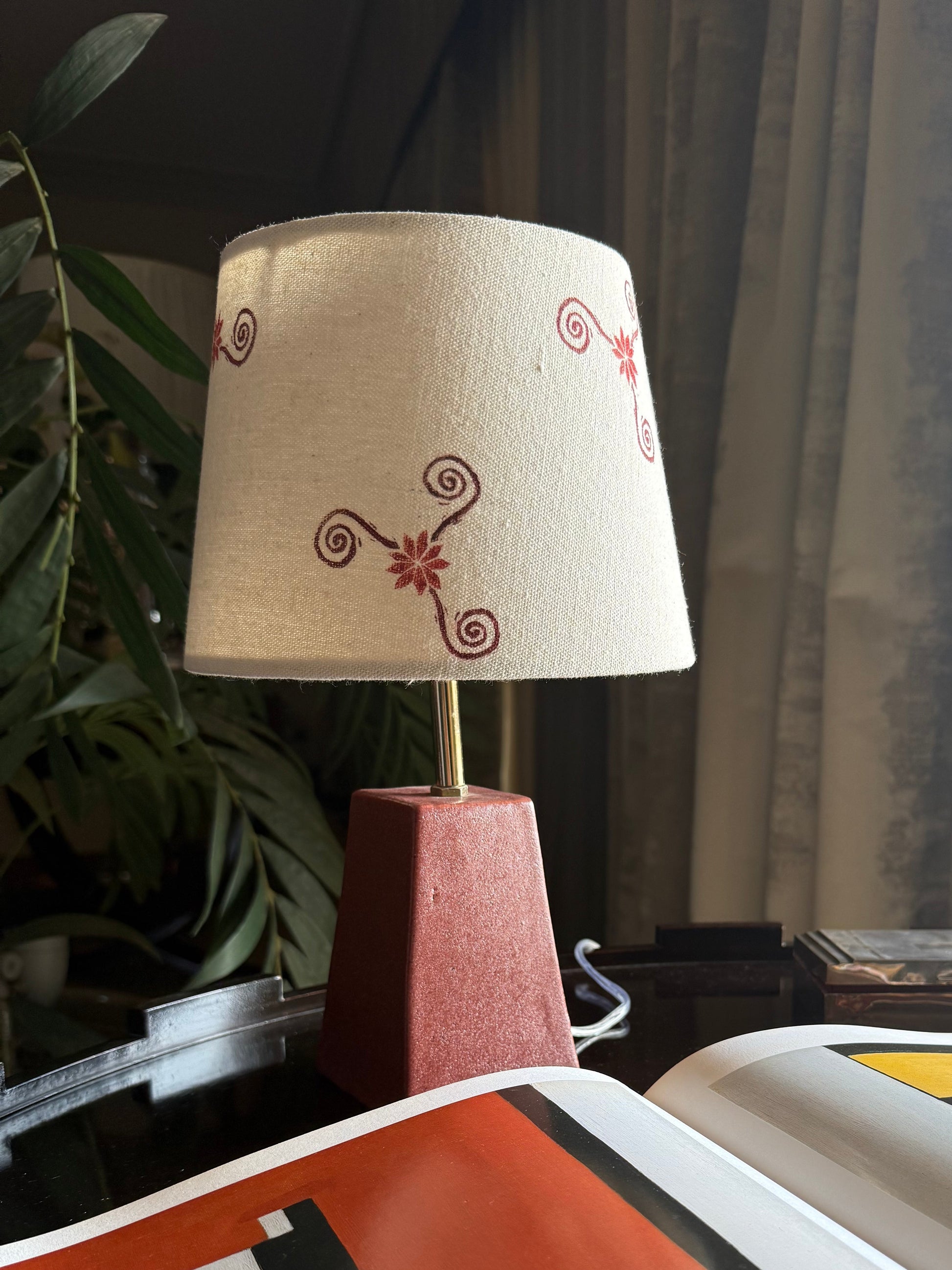 A small table lamp with a mud brick ceramic base and a shade inspired by moments of stillness and change in the desert.