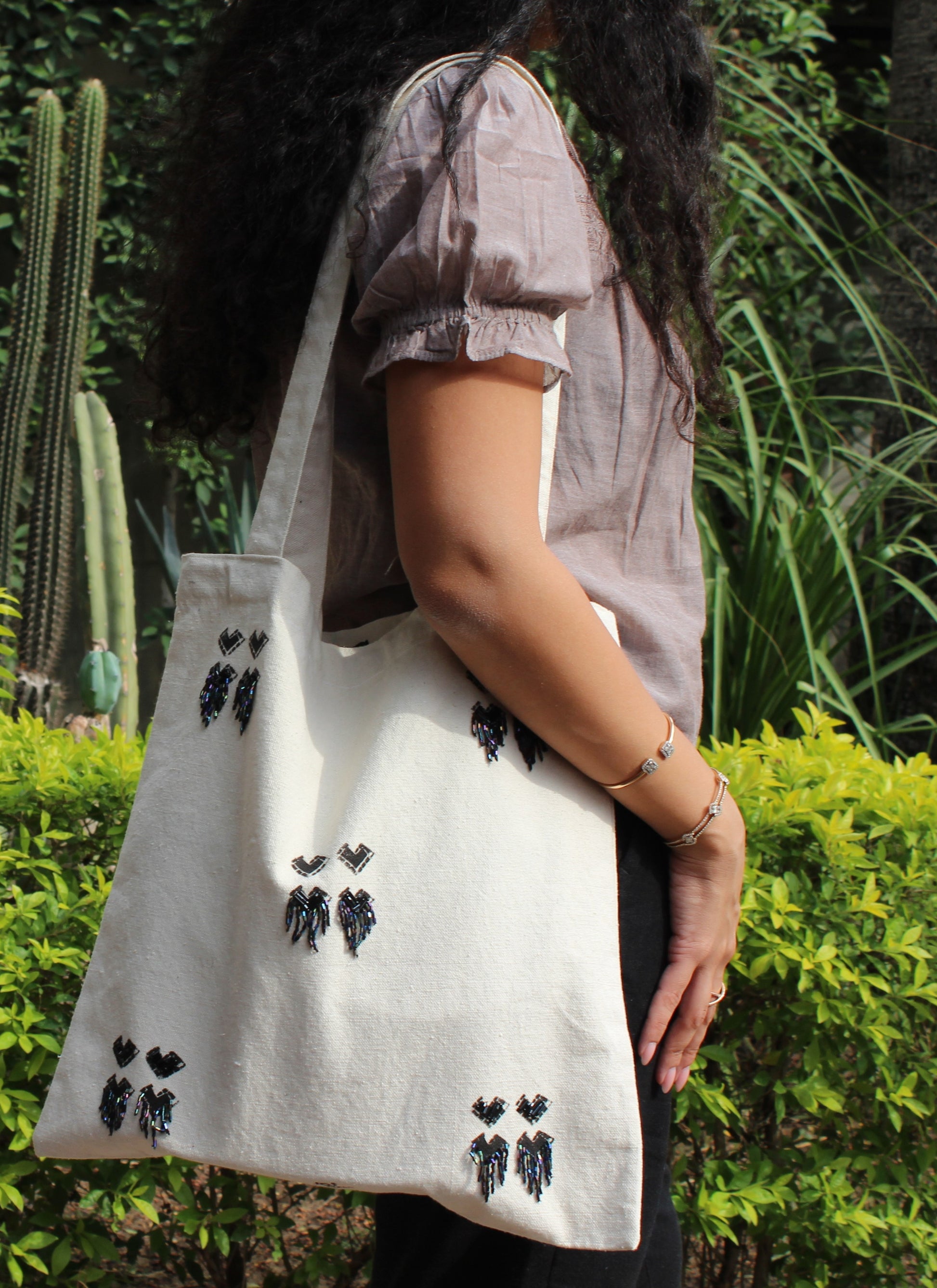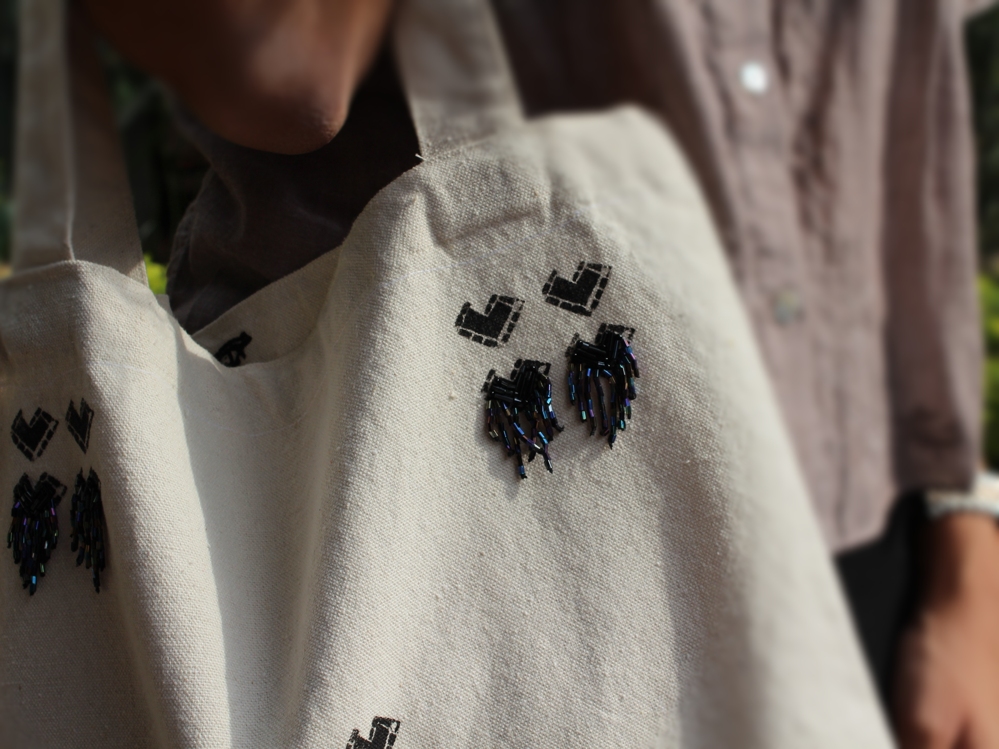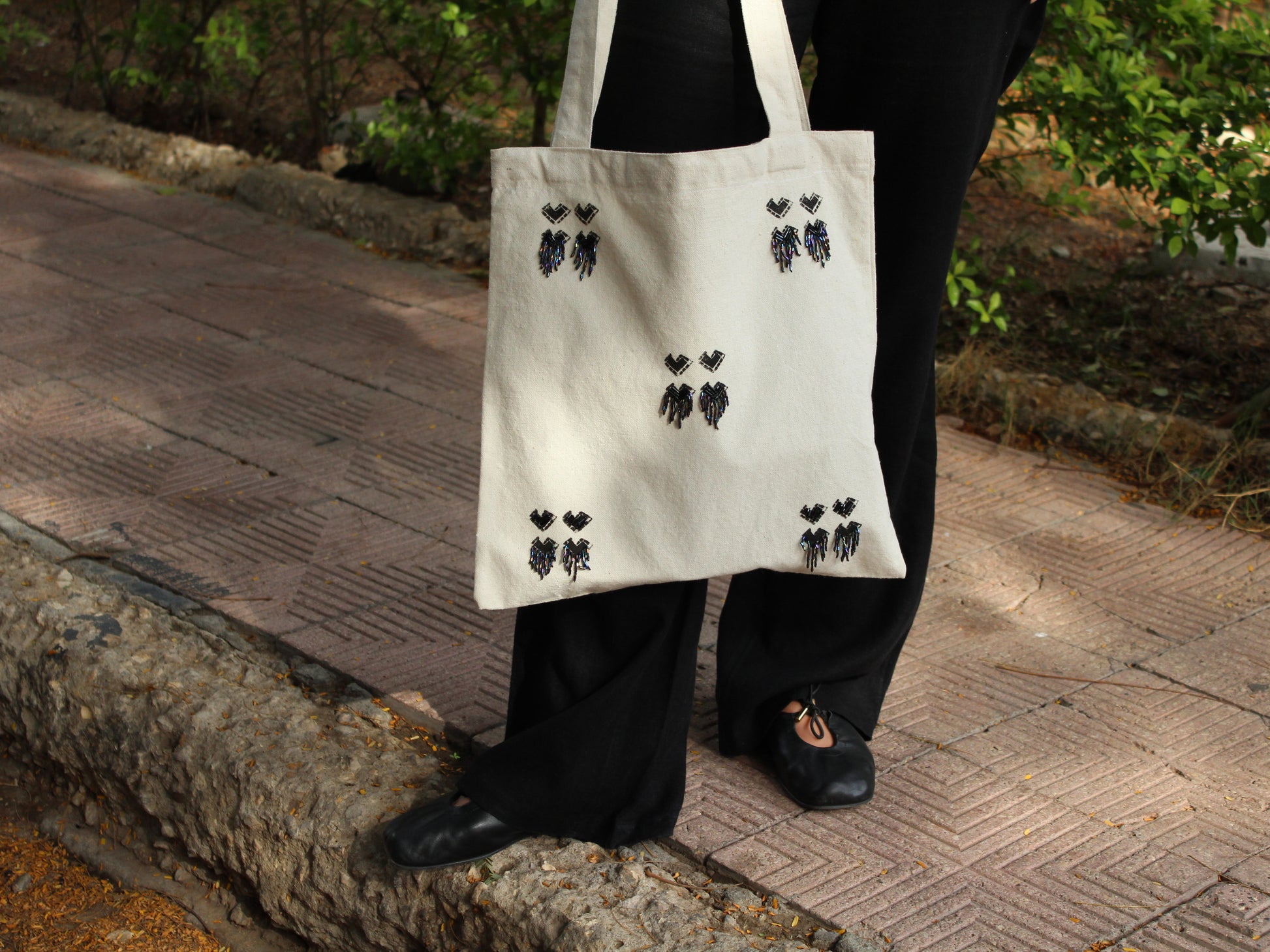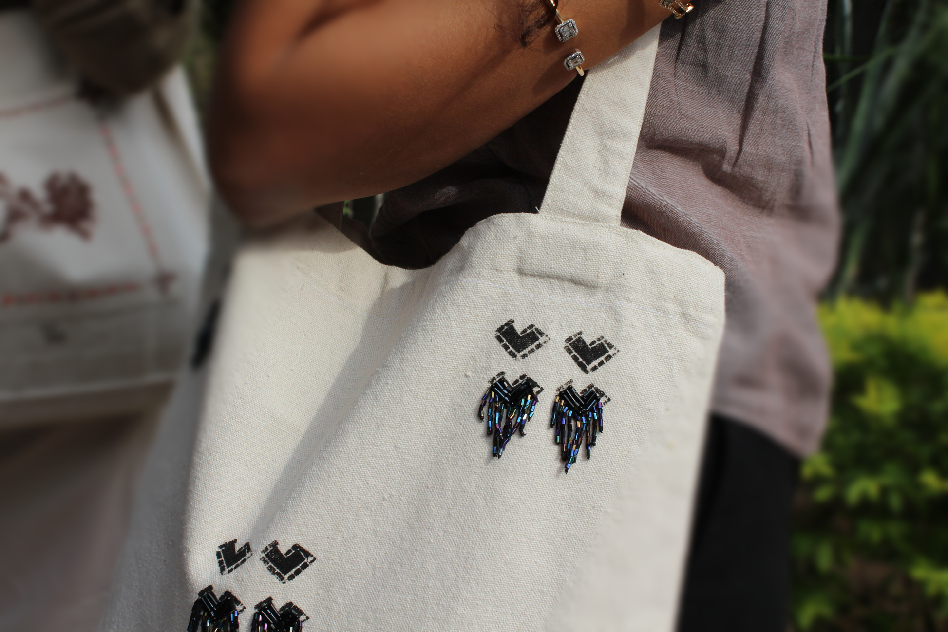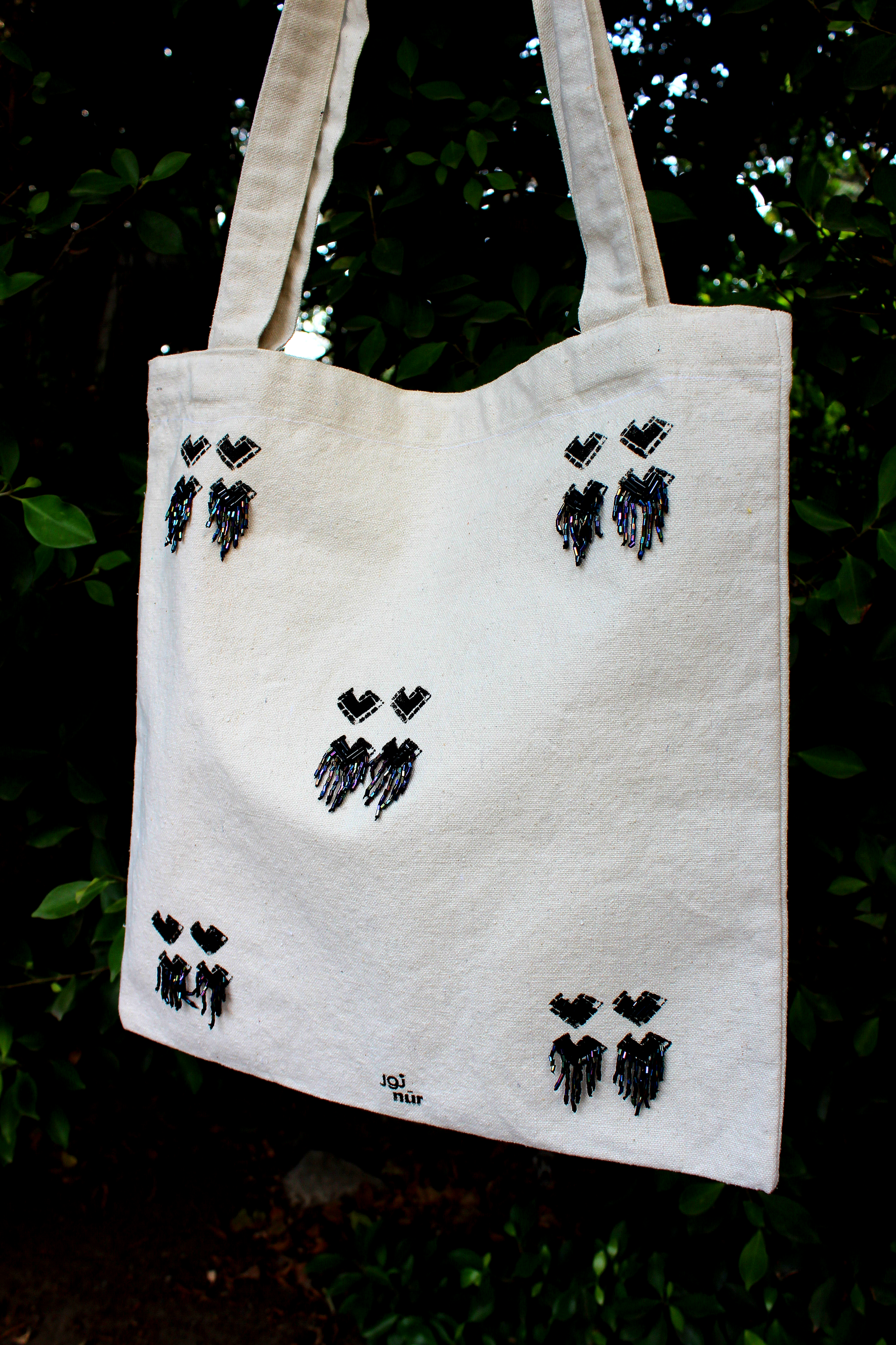 Tote in our With All My Heart design, hand-printed on locally sourced Duk fabric and enhanced with beads by @hagerelsayed/@3ion, adding texture and shine. Very limited quantities.
